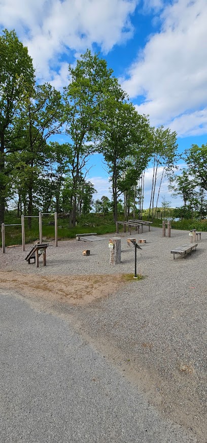 Fantastisk upplevelse: Ett utegym i samma stil som man ser runt om i Stockholm. Har dipp ställning i trä samt "pull-up bar" i stål. Har även böj med vikt bland annat. Här gäller lättare vikter eller kroppsvikt.